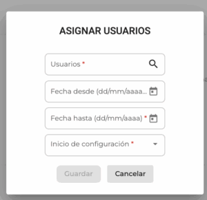 - Asignar usuarios: indicaremos los usuarios que tienen este turno, indicando la fecha de inicio y la de fin en la que queremos aplicar el turno, así como el día por el que empezará el usuario con el turno definido.