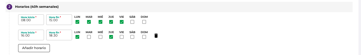 • Horarios: En esta sección, debes establecer el horario y los días que corresponden a esas horas. En la cabecera podrás ver el número de horas que tienes asignadas semanalmente según la configuración indicada. Podremos añadir diferentes franjas horarias, tantas como necesitemos. Por ejemplo: