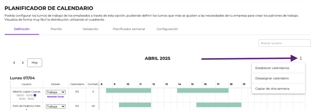 - Desasignar calendario: se quitará la asignación del calendario a cada empleado para la semana definida.