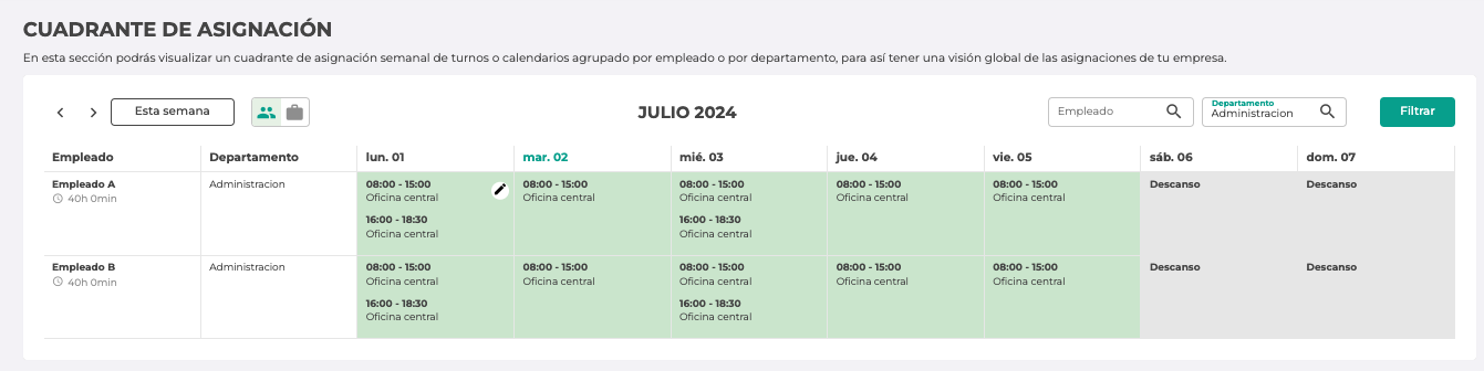 Para modificar el lugar de trabajo para un horario dado tendremos que hacerlo desde el Cuadrante de asignación.