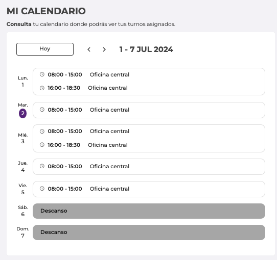 Cuando el empleado consulta su horario, bien en la APP o en la WEB, para cada franja horaria se mostrará su lugar de trabajo.
