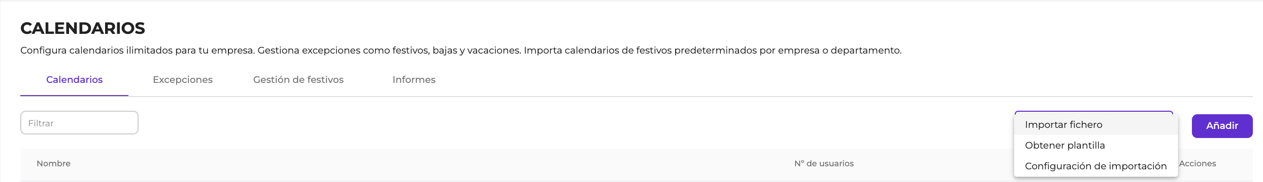 El primer paso es obtener la plantilla de importación. Para obtener la plantilla, en la opción de menú Calendarios, veremos un botón Gestionar Calendarios. Sobre este botón, nos aparecerá la opción Obtener plantilla en Calendarios.