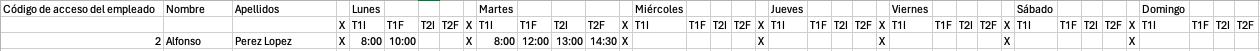 - Día de la semana: para cada día de la semana, tenemos las columnas T1I, T1F, T2I, T2F. Esto nos permitirá indicar hasta dos posibles turnos de horario en un día. Por ejemplo, si un empleado trabaja lunes de 8 a 10 y martes de 8 a 12 y de 13 a 14.30 definiremos: