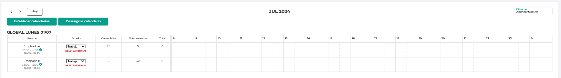 - Planilla horario: indicaré cual es la primera hora del día que quiero poder establecer como horario, y la última. Además identificaré el intervalo en el que quiero que se pinte la definición. Por ejemplo, ante la siguiente configuración: