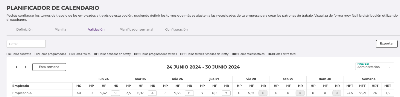- El lunes, el validador ha indicado que estuvo el empleado 4 horas (HR)
