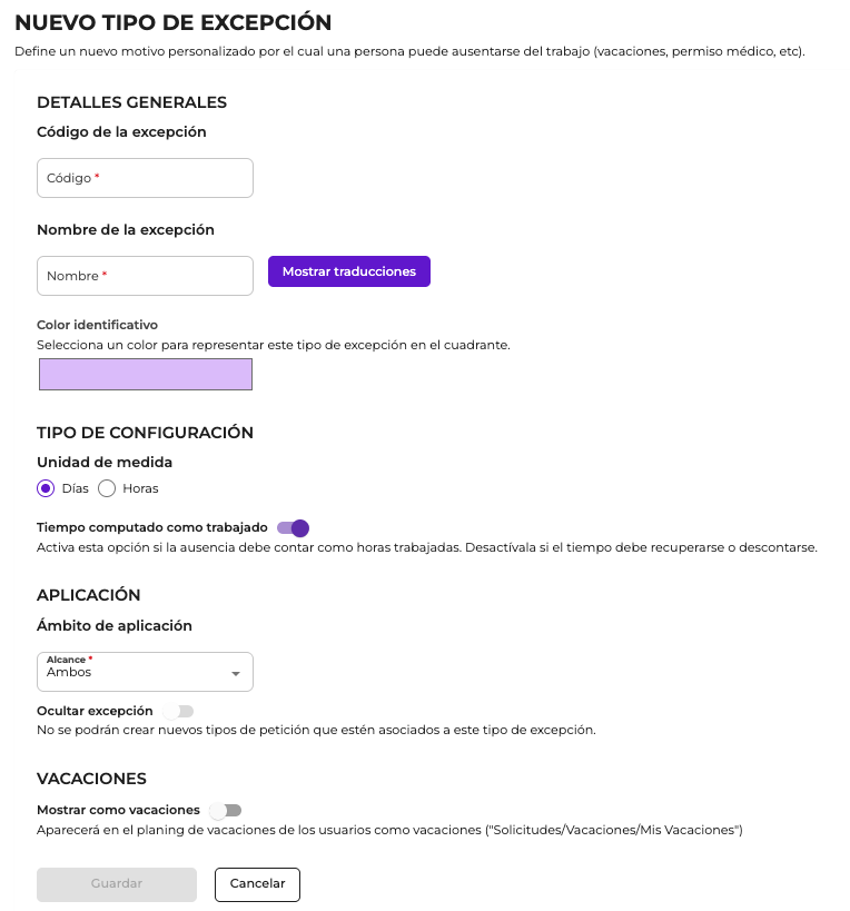 - Color identificativo: color con el que se mostrará las excepciones de ese tipo en el Cuadrante de asistencia.