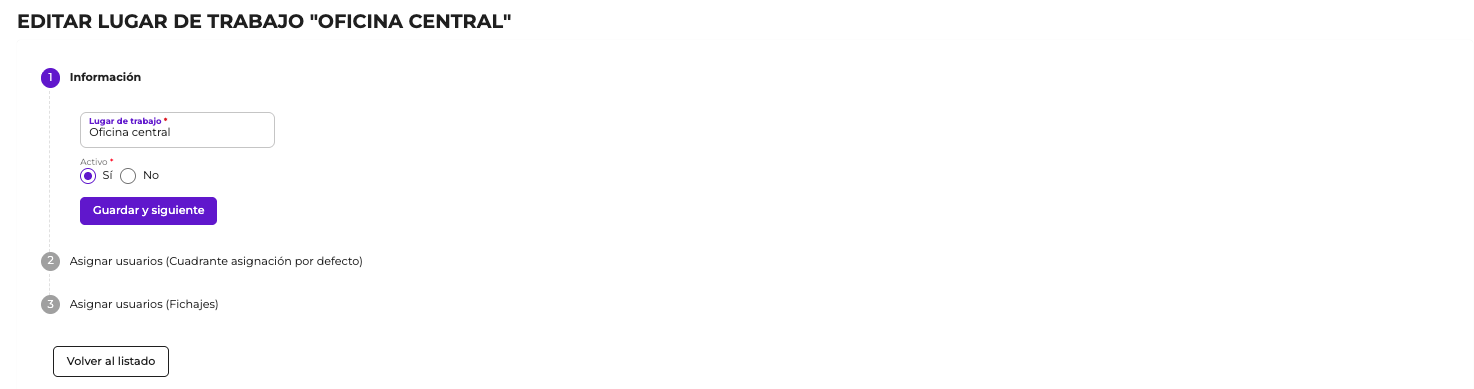 Indicaremos el nombre del lugar de trabajo y si está activo o no. Si no queremos que aparezca más un lugar de trabajo, lo marcaremos como no activo.