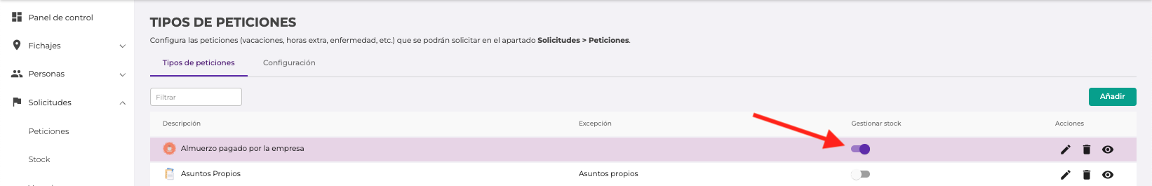 Para ello, crearemos un tipo de petición llamado “Almuerzo pagado por la empresa”. En el listado de Tipos de peticiones, marcaremos la casilla que indica que queremos gestionar el Stock.