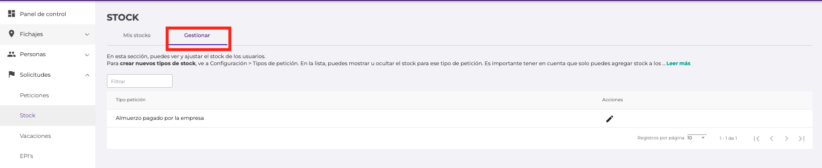 Al marcar la casilla, nos aparecerá la opción de gestionar el stock para cada empleado. Esto lo haremos desde la opción de menú Solicitudes → Stock, en la pestaña Gestionar.