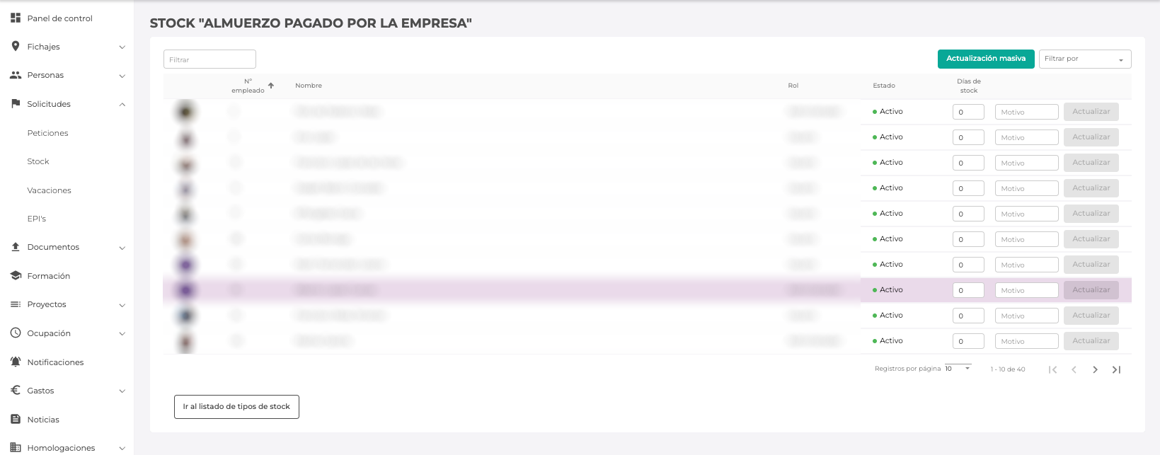 Al seleccionar el tipo de petición para el que queremos gestionar el stock, nos aparecerá la lista de usuarios para indicar el stock que tiene cada uno. Este proceso se gestiona de la misma manera que las vacaciones.