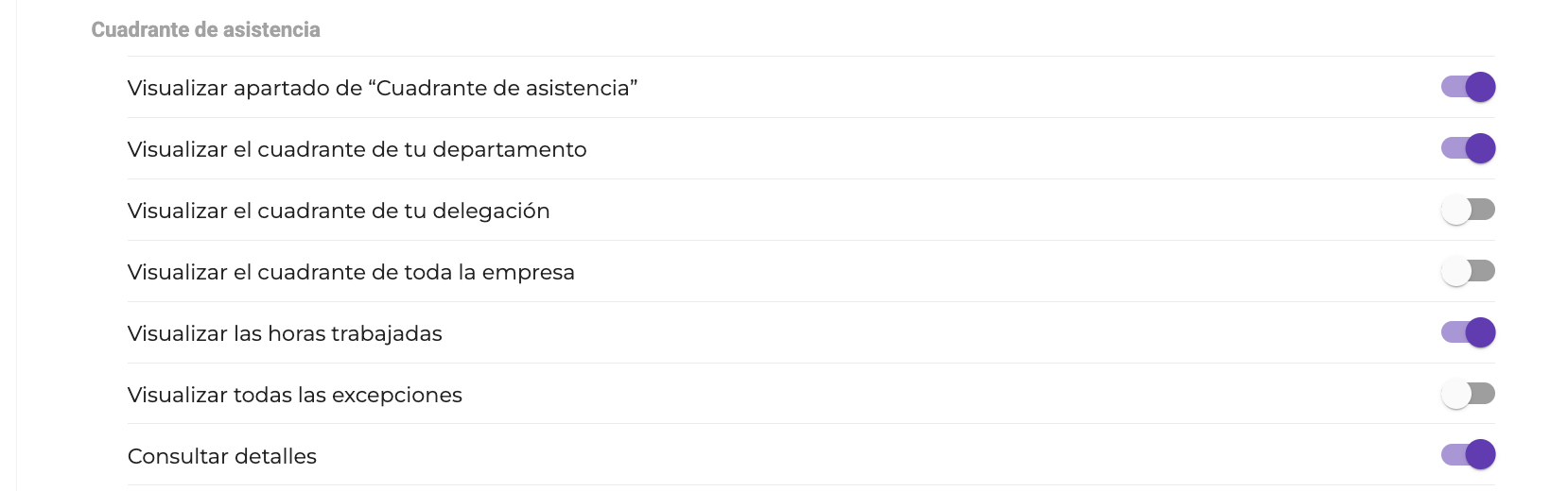 - Activa los permisos que consideres necesarios. Como mínimo necesitarás el «Visualizar apartado de Cuadrante de asistencia», «Visualizar las horas trabajadas» y «Consultar detalles».