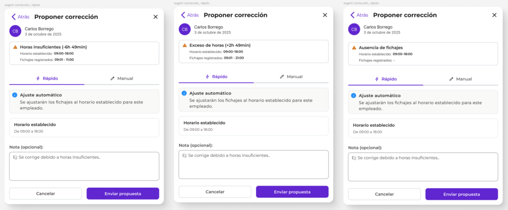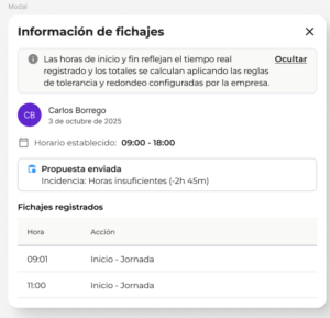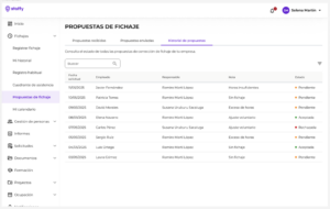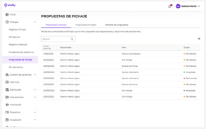 Cuando un responsable detecta un error en los fichajes de un empleado, puede enviar una propuesta de corrección.