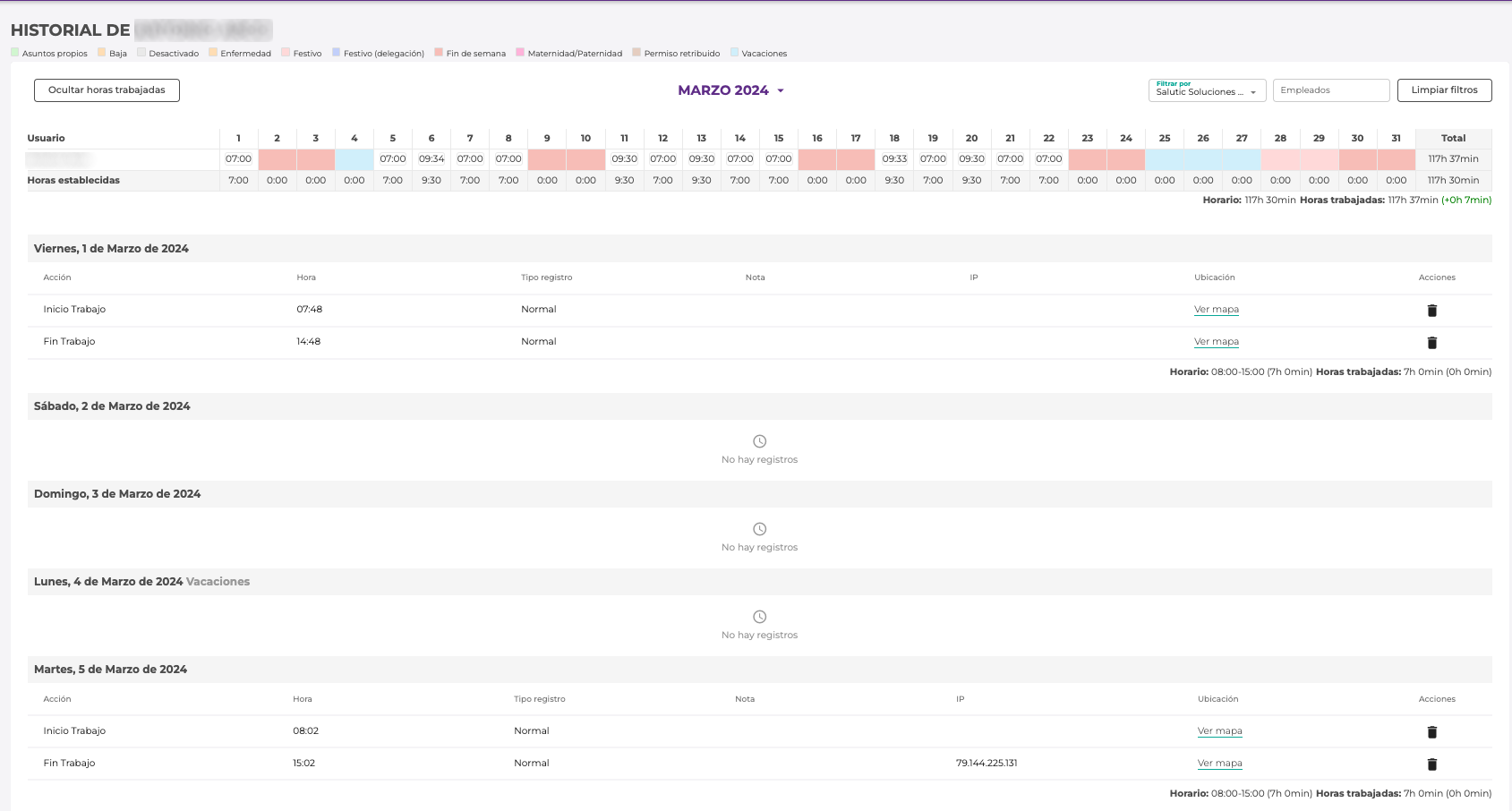 • IP y Ubicación: La dirección IP desde la que se hizo el fichaje y la ubicación correspondiente.