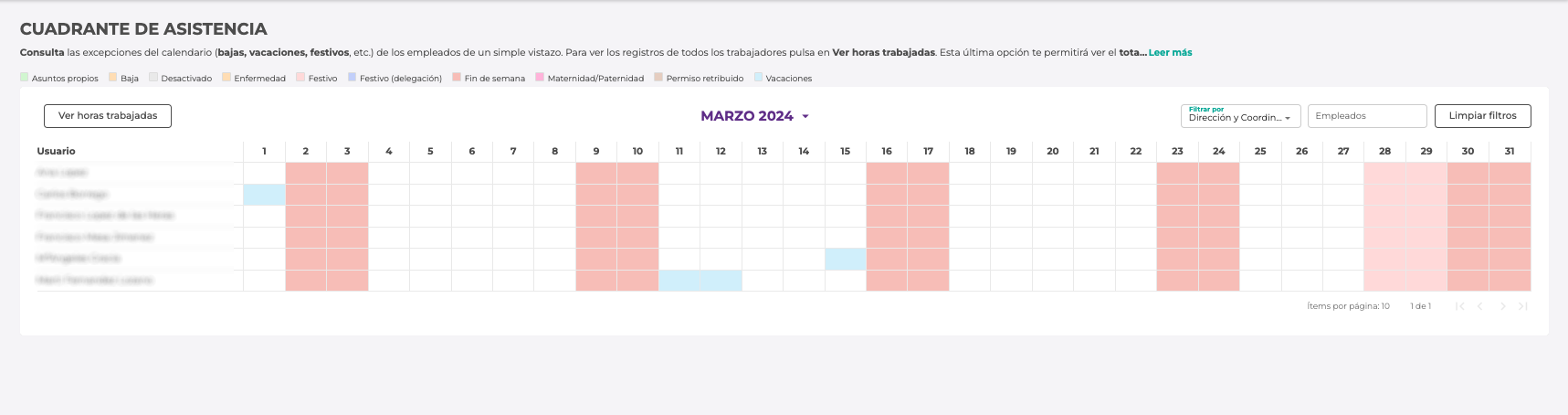 Para el mes seleccionado, el Cuadrante de Asistencia mostrará las diferentes excepciones, como días de vacaciones y festivos. Además, podrás utilizar la opción “Ver horas trabajadas” para consultar las horas trabajadas por cada empleado en cada día.
