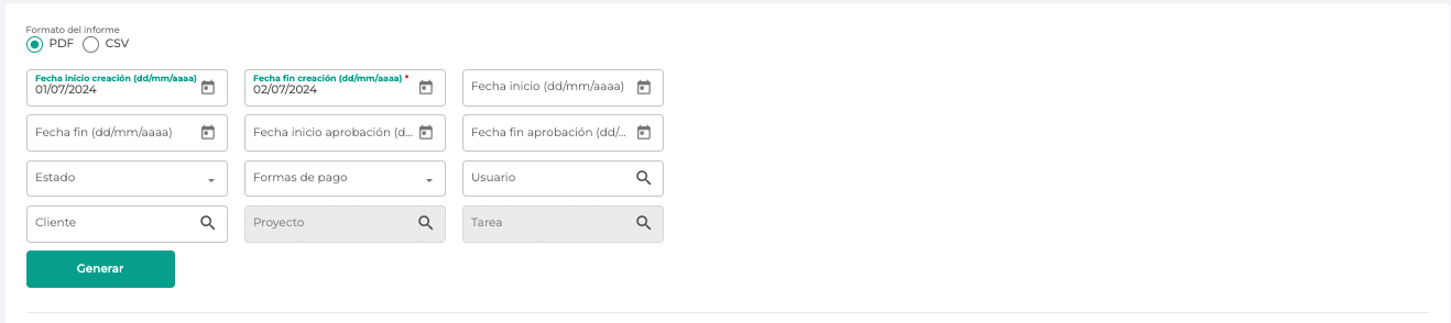 En esta pestaña nos encontraremos un filtro a aplicar para obtener el informe, bien en CSV o en PDF.