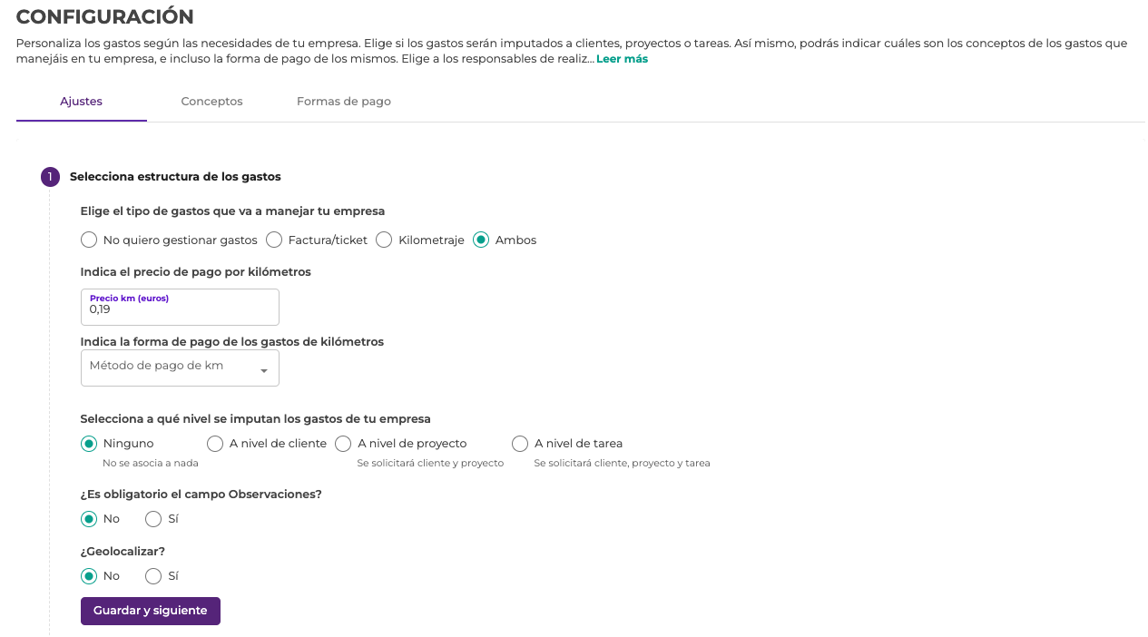 Podremos indicar si queremos usar el módulo de Gastos a nivel de Factura/ticket, kilometraje o amos.
