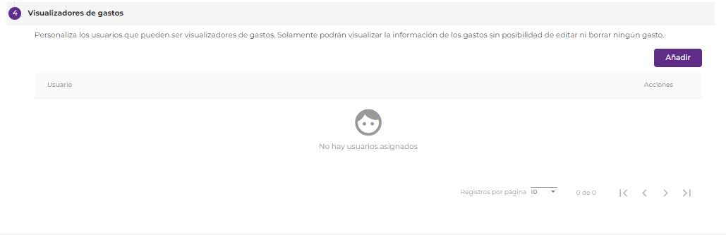 - Visualizadores de gastos: Podremos indicar qué usuarios son Visualizadores de las hojas de gastos.