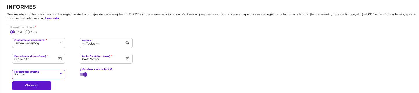 - Formato del informe: selecciona el formato simple, ya que muestra la información necesaria para la inspección. En el informe Extendido aparece información como la IP, geolocalización, tipo de fichaje, que no son requeridas por el inspector y no aportan nada a la inspección.