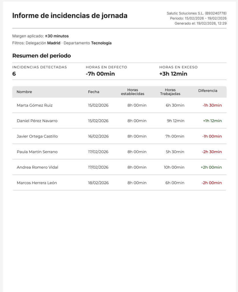 El Informe de incidencias de jornada permite identificar de forma rápida a los empleados que presentan irregularidades en su jornada laboral dentro de un periodo determinado. Este informe evita la revisión manual del cuadrante de asistencia y facilita la detección de fichajes incompletos o diferencias significativas entre las horas trabajadas y la jornada establecida.