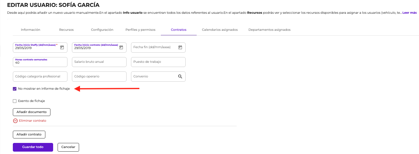 En la ficha del usuario, en la pestaña Contratos, podrás marcar el contrato para el que no quieres que el usuario se muestre en el informe de fichaje.