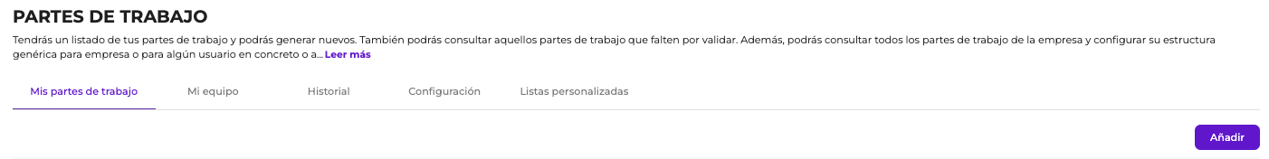 • Configuración: configuración permitida dentro de los partes de trabajo.